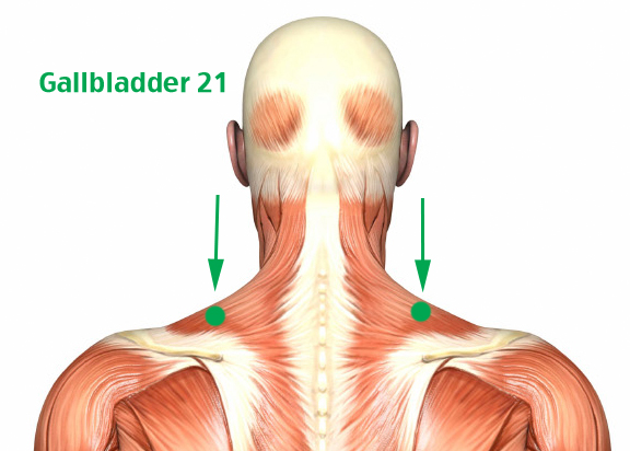 Place both hands on Gallbladder 21 (GB 21) and gradually apple firm pressure. Take slow, deep breaths and hold for one minute. Release. Relax your body.